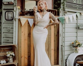 This graceful dress with a striking neck detail won't fail to impress. Naomi y121204 we have a size 4/5 ready in ivory to be shipped immediately. Hi everyone,i've been requested to make the falling neck/cowl neck dress from scratch. We believe in helping you find the product that is right for you. We think this sparkly wedding guest dress with sleeves would be perfect for a new years eve wedding.